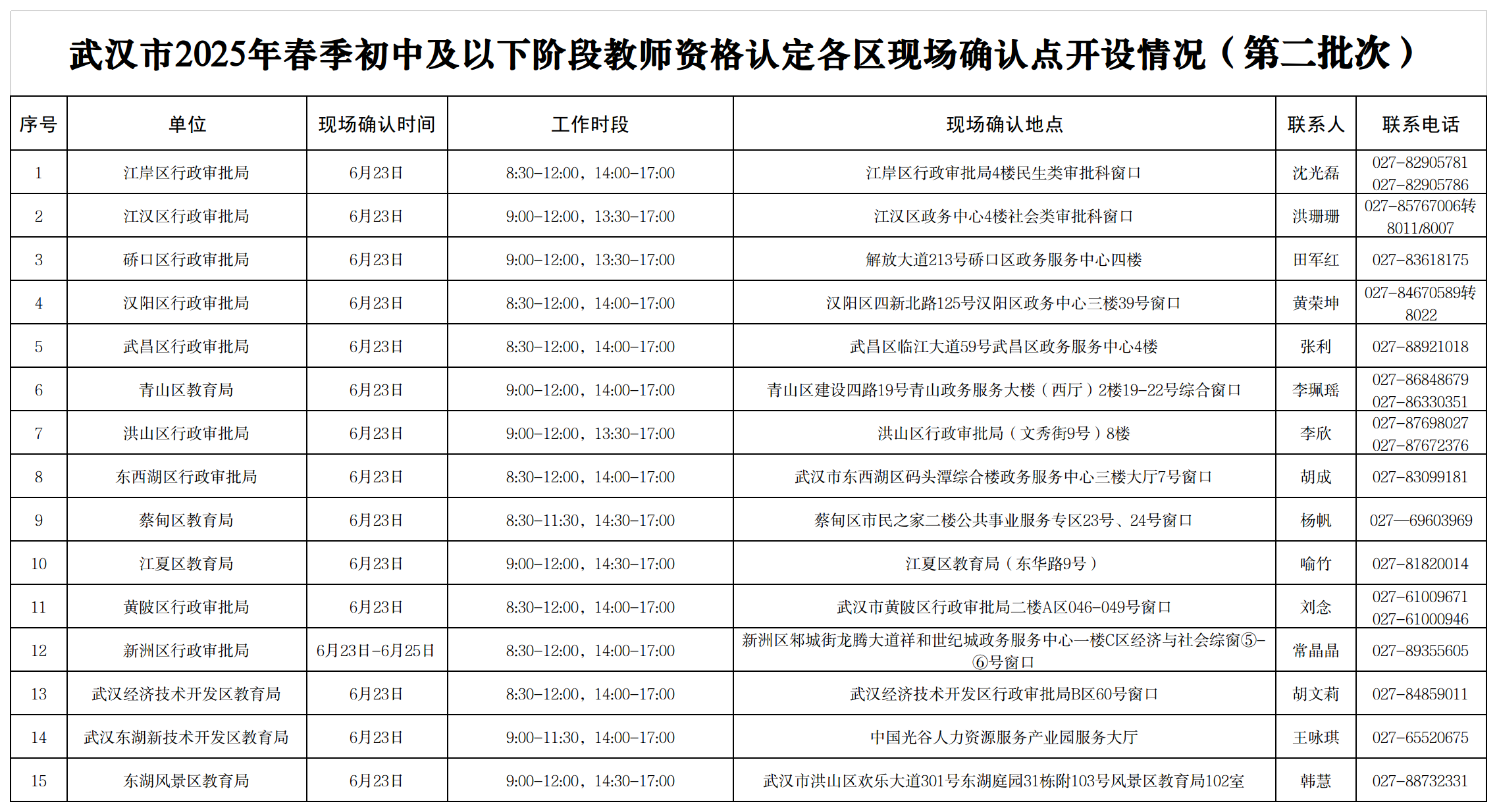 武汉市2025年春季初中及以下阶段教师资格认定各区现场确认点开设情况(第二批次)