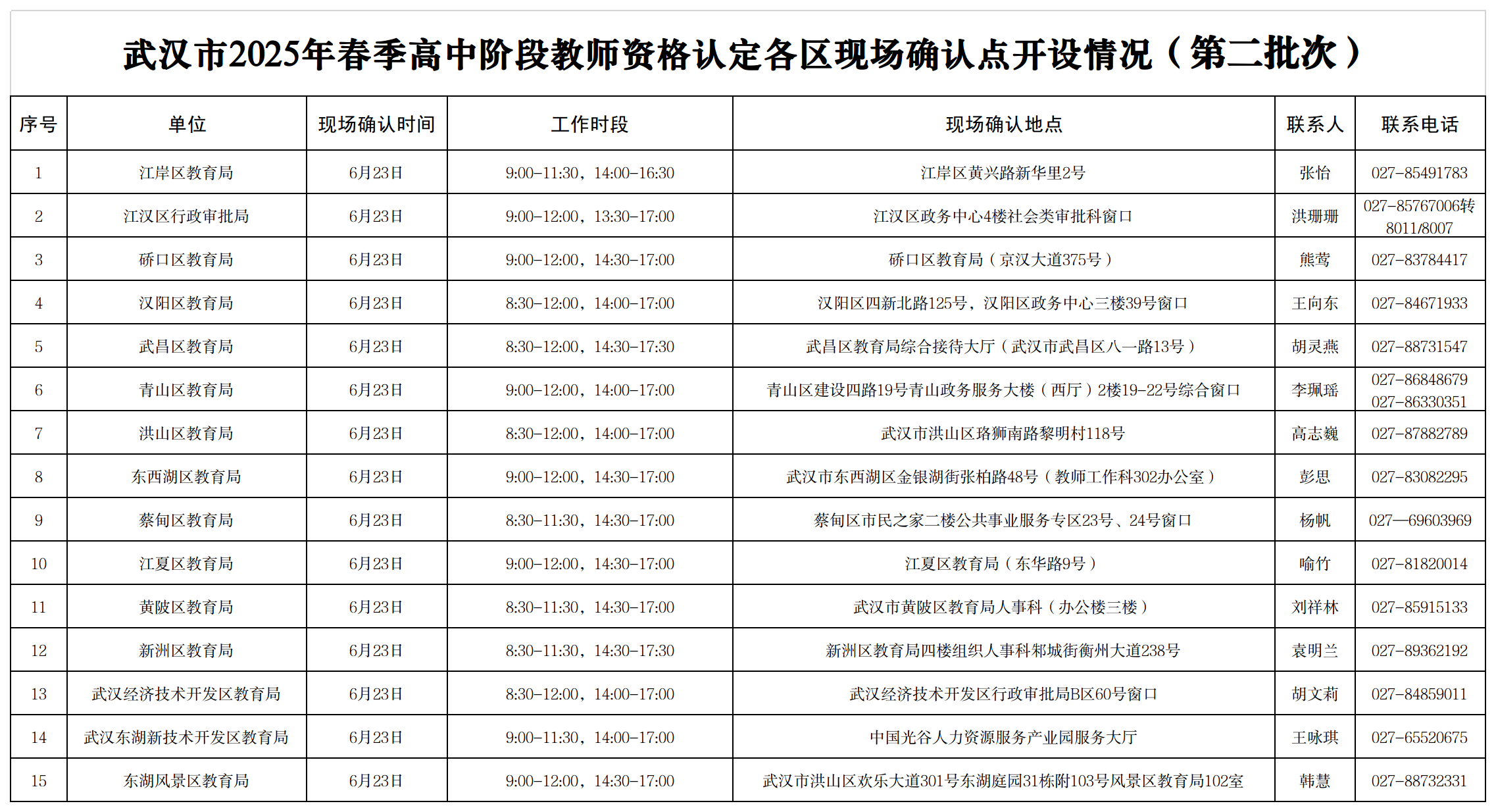 武汉市2025年春季高中阶段教师资格认定各区现场确认点开设情况(第二批次)